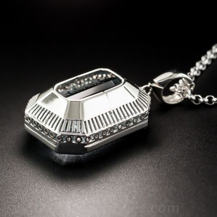 Cool soothing pastel blue simplicity shines from this minimalist jewel. An emerald-cut aquamarine, weighing 24.45 carats, suffused with a glistening crystalline glow, is beautifully bezel-set in a hand fabricated platinum pendant adorned all around with a delicate pierced geometric pattern. The enchanting gemstone swings and sways and shimmers from an adjustable length platinum chain and the cleverly hinged bail allows it to be used as an enhancer to any pearl or bead necklace.