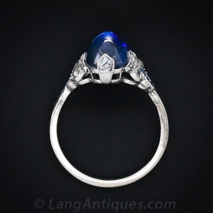 This unusual Art Deco sapphire and diamond ring showcases a vivid blue elongated oval cabochon cut sapphire weighing 3.45 carats. It is flanked on each side by three twinkling rose cut diamonds and three square calibre cut sapphires. The stunning center sapphire is completed with a rose cut diamond set at each end. A bold, yet delicate Deco dazzler!