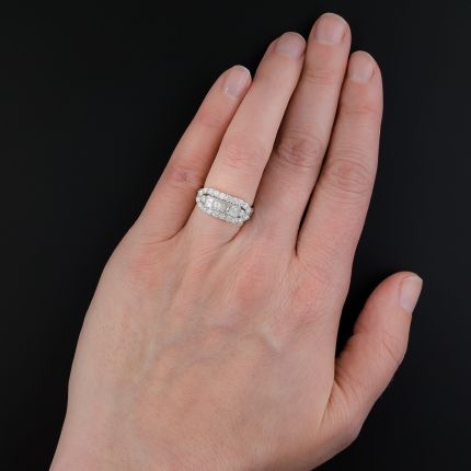 A central row of seamlessly-set square-cut diamonds, fully wrapped with sparkling round brilliant-cut diamonds, gentry curve around your finger in this dynamic dazzler rendered in gleaming platinum. 1.53 carats total diamond weight, 5/16 inch, Currently ring size 5 3/4.