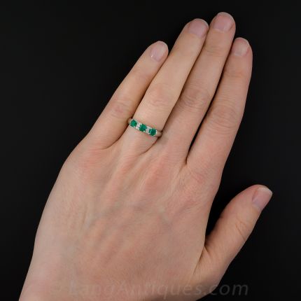 A charming estate band ring rendered in glorious green (emeralds) and white (diamonds), sleekly styled and crafted in platinum. Three emeralds weigh .72 carat, diamonds total .06 carats. Currently ring size 6 1/4.