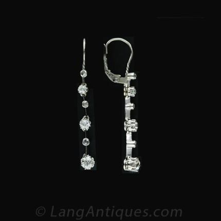 Antique diamonds drop from the ear on knife-edge dangles in these platinum earrings. Alternating rose cut diamonds and old mine cut diamonds gently graduate in size as they sway below the ear. These earrings measure 1 3/4 inch long.The Diamonds are described as follows:Six Old Mine Cut DiamondsWeight: 1.10 carat total weightColor: H-JClarity: SI-I1Six Rose Cut DiamondsWeight: .05 carat total weightTotal Diamond Weight: 1.15 carat