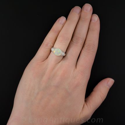 Sleekly tailored in gleaming platinum, this comfortable low-profile finger-hugger glistens and glows with a horizontally-set opal, suffused with a bright and shining melange of electric pastel colors. The enchanting gemstone is embraced on each side with double diamond-set bands leading to a gently tapered ring shank. A stunning and exceptionally well priced estate jewel dating from late last century. Currently ring size 6 1/4.