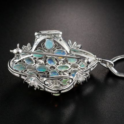 A geometric bouquet of diamond-centered, opal-petaled flowers overlap to create an artful evocation of eternal springtime in this strikingly scaled (1 1/2 inch), fresh and fabulous, pastel-hued adornment rendered in gleaming platinum. One-of-a-kind! The lithe serpentine platinum chain measures 15 inches.