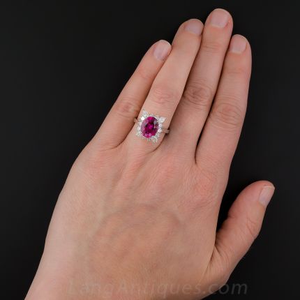 It's somewhat challenging to describe the gorgeous, deeply saturated, rich raspberry color of this spectacular 3.40 carat faceted oval red tourmaline (a.k.a. rubelite). The glorious gemstone glistens and glows from within a bright white and sparkling halo composed of fine round brilliant-cut diamonds with marquise diamonds radiating from the corners. Hand-fabricated in platinum, this colorful smile making bauble measures 5/8 by 9/16 inch. 1.50 carats total diamond weight. Currently ring size 6 1/2.