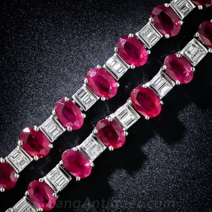 A gorgeous and glistening necklace and bracelet suite rendered in glorious red & white. Sturdily crafted in platinum, this classic ensemble glitters and glows all 'round with deep, rich red Burmese rubies (totaling 40 carats) alternating with pairs of bright-white and shining baguette diamonds (totaling 8.50 carats). Truly stunning and extremely well-priced. The necklace measures 16 inches, the bracelet measures 6 5/8 inches.