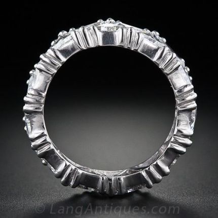 Here is a remarkable all-round diamond wedding band composed of twenty two interlocking triangular-cut diamonds, totaling 4.50 carats, masterfully (seamlessly) set in platinum. A stunning, shimmering sensation in size 5 1/2. Please note that this ring cannot be sized.