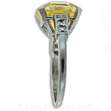 This ring is an authentic Art Deco ring circa the 1930s. The center stone features a nine carat yellow sapphire cut in a square Asscher style. This style has had a resurgence of popularity especially in diamonds recently. The shoulders are simply channel set with French cut square diamonds, also very popular during the Art Deco period. A French cut diamond has a square outline with a criss cross facet configuration. They sparkle more than square or emerald cut diamonds.The gemstones are described as follows:One Asscher Cut Yellow SapphireWeight: 9.00 caratsMeasurements: 10.78 x 10.19 x 7.67 mmHue: YellowTone: MediumClarity: Lightly Included, Type II GemstoneSix French Cut DiamondsWeight: .40 carat total weightColor: F-GClarity: VS1-SI1