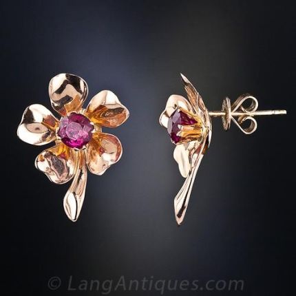 A pair of wine-red tourmalines (dead ringers for rubies) glow from the center of rose gold flowers in these light, fun and festive vintage earrings - circa 1940s-1950s. Just shy of 1 inch from stem to petal.