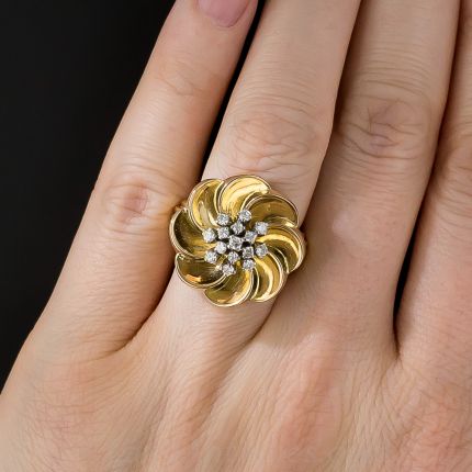 A bold gold flower blossom, stylized as a kinetic pinwheel, sprouts a sparkling cluster of bright-white diamond-set stamens, totaling 1/3 carat, in this chic and stunning Retro ring dating from the fabulous 1940s-50s. The almost three-quarter inch diameter flower (11/16 inch) is supported by a gracefully scrolled under gallery and a fully fluted ring shank. This charming ring is a size 6.