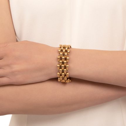 If suddenly you only had only one bracelet in your jewelry box, this would be a good one to have. Fluted pear-shaped links of brightly burnished 18K yellow gold connect to create this classic Retro/Mid-Century jewel (circa 1940s-50s). It makes a striking statement whether you're wearing a black turtleneck, a little black dress, or your favorite t-shirt and jeans. Eminently wearable and eternally chic. Crafted in 18K gold, it measures 7 1/2 inches.