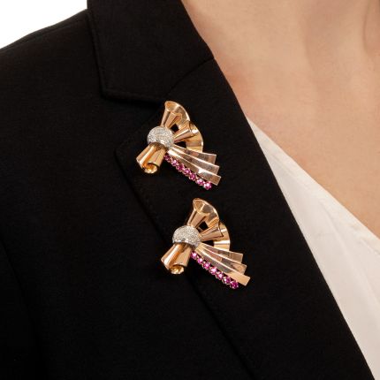 Although virtually de rigueur during the 1920s-1930s days of Art Deco, you don't see many double clip brooches from the 1940s Retro period, and this beauty exhibits a perfect blending of the two styles. Undulating, multi-dimensional bows, tied up with sparkling diamond-set ribbons, join forces in the center while ribbons outlined with synthetic rubies* flare outward, all of which are artfully hand sculpted in radiant 18K rosy-yellow gold. Whether worn together as a brooch, or separately as clips, these twin baubles are fabulous. *Back in the day, due to their uniformity of color and flawless clarity, synthetic rubies were considered a modern improvement over their natural counterparts, besides the fact that the virtually undetectable differences are only discernible with a microscope.