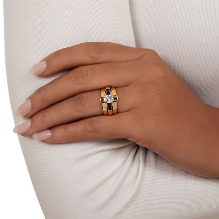 Here's a cool one. Dating back anywhere between the latter 1930s and 1940s (the artful blending of geometric Art Deco and Retro styles makes it hard to pinpoint), this sleekly designed finger-hugger, hand fabricated in gleaming 14K yellow gold, presents a bright-white and sparkling European-cut diamond having the double-lucky weight of .77 carat. The scintillating stone is accented on each side by pairs of rich cobalt-royal blue sapphires flush-set into the raised center band. Striking! Total sapphire weight, .50 carat. Currently ring size 5 3/4.