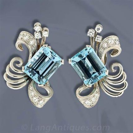 Platinum aquamarine and diamond retro earrings featuring two emerald cut aquamarines (14.00 carats total weight) set amongst a swirling ribbon bow motif set with round brilliant and single cut diamonds (22 total, 1.00 carat total weight, G-H color, VS-SI clarity). Earrings measure 1 1/8 X 3/4.