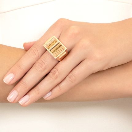 No rubies. No aquas. No wildly curving volutes. This is radical Retro. Hand fabricated in 14K rose gold, it is a bold structure of subtle curves and crisp angles, topped by a geometric assemblage composed of a half-cylinder, accented in striking contrast by a pair of grooved prism shapes. Frill-free architectural chic, circa the 1940s. Now, and forever (due to its construction), ring size 7.