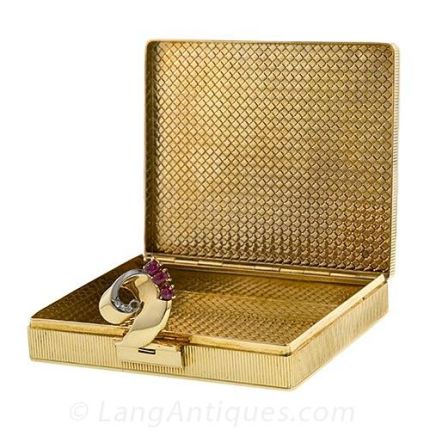 14K Yellow gold Retro cigarette case with an exquisite woven top and bottom and fabulous asymmetrical swirl motif latch brightened with three cabochon rubies and three small diamonds. From the age of glamor. This cigarette case measures 3 by 3 1/2 by 5/8.