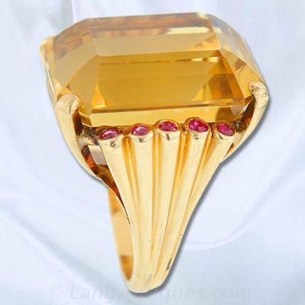 Bold and vivacious! 14K Yellow gold 1940s Retro ring set with an impressive 57 carat Asscher-cut citrine flanked by five lipstick red rubies on either side (.50 carat total weight).