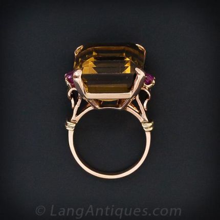 A large-ish scale fun ring featuring a dark golden Citrine accented with a pair of round rubies in two-tone rose and yellow gold from the 1940s. The citrine alone measures 13/16 inches long by 5/8 inches wide.