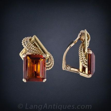 These wonderful mid-century earrings are elegantly rendered in 18K yellow gold and highlight a pair of gorgeous golden-honey color Citrines. The Citrines are enhanced with a graceful sweep of rope which wrap around and through a golden chevron. Tres cool.