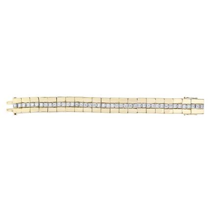 A platinum Art Deco diamond straight line bracelet gets updated in the 40s and set into a chunky 14K yellow gold link bracelet. This bold bracelet features two diamond set links set into each convex rectangular link.The Diamond information is described as follows:Forty Three European Cut DiamondsWeight: 3.50 carats total weightColor: F-GClarity: VS-SI