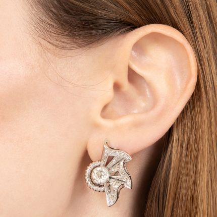 Gracefully curved 'ribbon fans,' dusted with tiny single-cut diamonds, extend from dazzling old-mine cut diamonds (total weight, 1.45 carats)—each embraced by a fluted crescent—all together creating these fetching and festive Retro earrings. Total diamond weight, 2.20 carats. Hand fabricated in 18K white gold, they attach via post/clips.