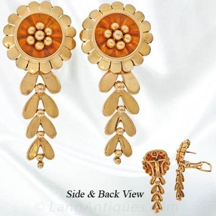 These funky Retro drop earrings, fashioned in 18K rose gold, feature a stylized flower motif with a swaying drop leaf motif. These earrings have lever backs and measure about 1 1/2 long by 3/4 wide.