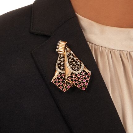 Evocative of an elegantly tied scarf, this airy openwork Retro brooch sparkles with scintillating single-cut diamonds and is brightened by pinkish-red square-cut rubies. An uncommon design that will add a dash of fetching 1940s style wherever you choose to pin it. 2 1/2 inches long. Total diamond weight - .85 carat, total ruby weight - 1.50 carats. Hand fabricated in 18K rose gold and 14K white gold.