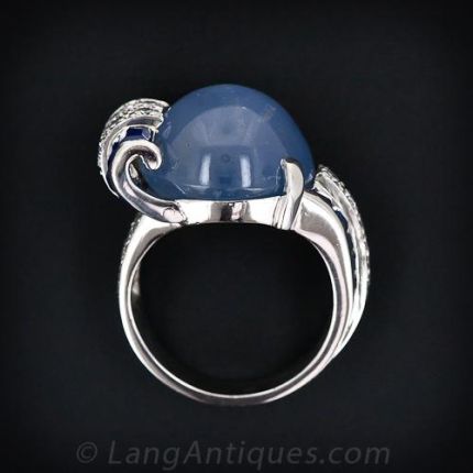 A fantastic high-style work of art in blue and white! This entrancing creation in sapphires and diamonds from the late 1930s - 1940s was inspired by its shimmering cornflower blue cabochon sapphire, which we estimate to weigh 19.00 carats. The sapphire is enfolded in a high sparkling wave of calibre sapphires and diamonds which is mirrored in its design on the opposite shoulder. The sapphire exhibits mild to moderate asterism, i.e., the star effect, but who cares? This is a truly marvelous ring for a discriminating connoisseur.