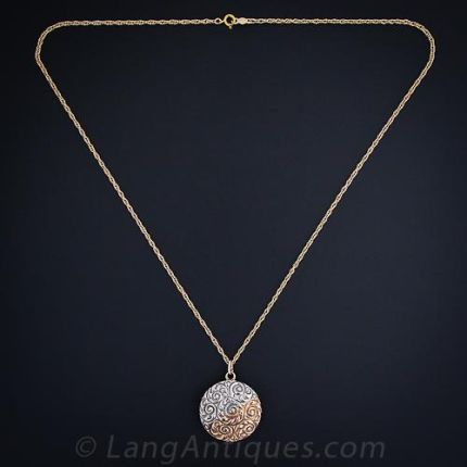In this unique Victorian locket we see gorgeous repousse work and an early use of platinum. The front cover is designed in a swirling pattern, split on the diagonal. One side is platinum and the other is rose gold as well as reverse. It opens to reveal a compartment for a keepsake. Circa 1885.