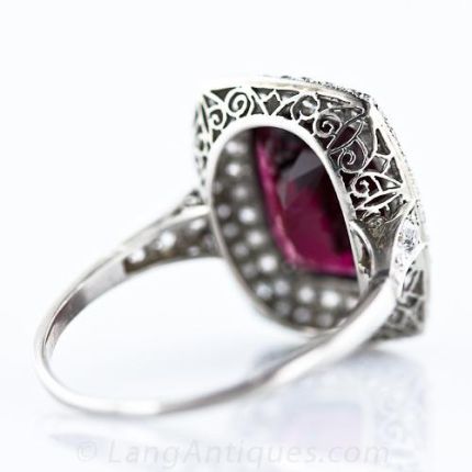A deep rich burgundy red tourmaline (or 'Rubellite') sits low in a sparkling platinum and diamond cushion shape mounting which perfectly follows the outline of the gemstone. This early Deco, or Edwardian, style ring beautifully resembles the original with European cut diamonds, intricate gallery and milgraining. Elegant.