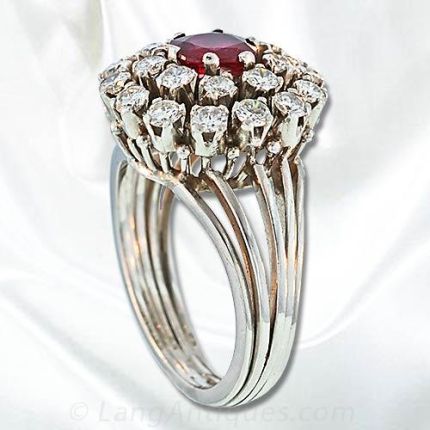 Platinum ruby and diamond cluster ring featuring a central cushion cut ruby (1.00 carats) wrapped in two rows of prong set diamonds (23 total, 1.30 carats total weight, H-J color, VS-SI clarity).