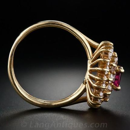 Vodka with a splash of cranberry or a smashing cocktail ring? Grace your finger with this ring centered with a brilliant 1 carat oval-cut ruby encircled with two rows of diamonds set in 18 karat yellow gold. The diamonds are old mine cuts and have a total weight of 1.50 carats (H-J color, SI clarity).