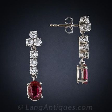 A classic pair of ruby and diamond drop earrings each featuring six sparkling round brilliant-cut diamonds with a total weight of 1.50 carats and a two beautiful oval-cut rubies weighing 2.61 carats total swaying below.