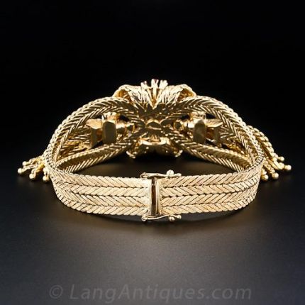 A wonderful and weighty 18 karat yellow gold Italian made double tassel bracelet, circa 1950s-60s. Two flat, textured double herringbone chains culminate in a flowing multi-dimensional wreath motif glistening with small round sapphires and rubies. Right and left of the centerpiece a pair of articulated tassels dance with your every movement. A fun and fanciful mid-century bracelet. 7 1/4 inches long.