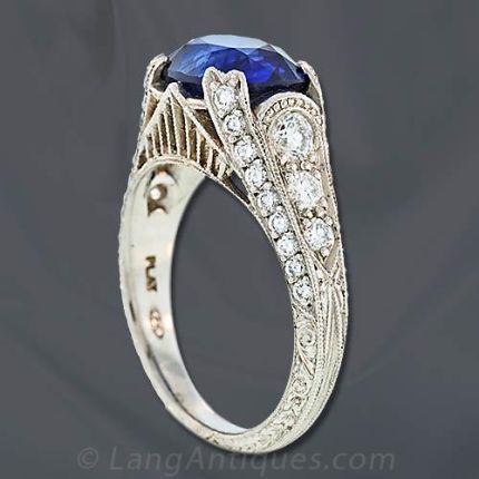 Ladies ring created in the art deco style featuring one 3.57 carat intense saturated blue sapphire gem. The ring is embellished with 42 round cut diamonds with a total weight of .75 carats (FG color, VS2 – SI1 clarity). The ring is finished with hand engraving and milgrain details.