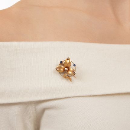 Clover leaves are generally more heart shaped, however, whatever the genus may be, this shimmering three-leaf jewel, artfully sculpted in warmly burnished 14K yellow gold, circa 1900, boasts a lustrous natural pearl, a pair of blueberry-blue sapphires, diamond dew-tipped leaves and a ribbon-like stem. Sweet and lovely, it measures 1 1/8 inches.