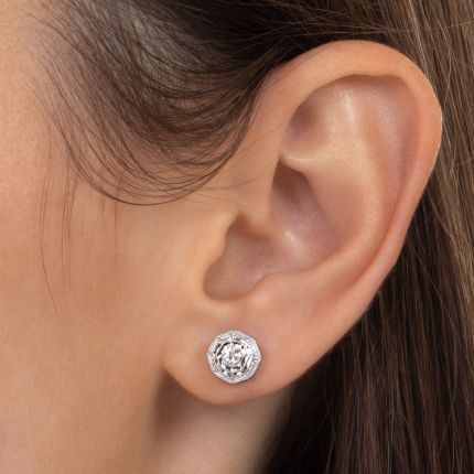 Illuminate your lobes with these octagonal sparklers, crafted in decoratively embossed 14K white gold and set with a pair of bright-white round brilliant-cut diamonds. The mountings are latter-Art Deco (circa 1930s), the diamonds are modern cuts. Total diamond weight, .20 carat.