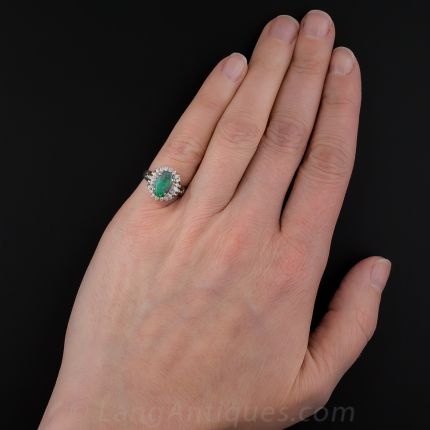A modestly proportioned yet enchanting Australian black opal, suffused with iridescent peacock colors, glistens and glows atop a glittering halo composed of small bright white round diamonds plus a pair of tapered baguettes, all presented in gleaming platinum. A beautiful and beautifully priced estate jewel. 9/16 by 1/4 inch, currently ring size 5.