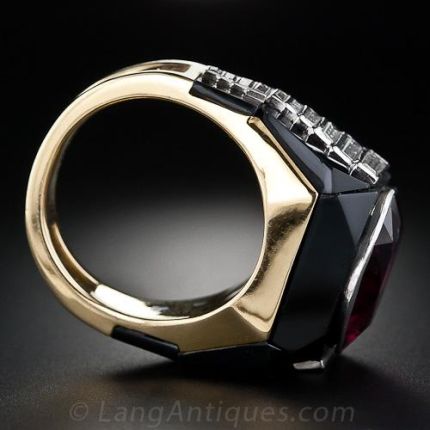 On a grand scale, this fabulous ring showcases a deep raspberry-red oval-shaped rubelite tourmaline weighing 13.00 cts. Expertly cut black onyx plaques create a framework for the gem with a streamlined row of graduated, shimmering, baguette-cut diamonds running down the ring's sculpted shoulders. A bold and dramatic, masterfully crafted one-of-a-kind work of jewelry art. Total diamond weight: 1.50 carats.