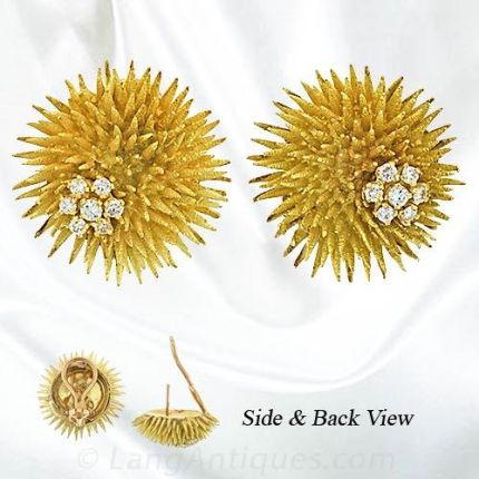 Spike up your life with these 18K yellow gold spiky sea creature motif earrings dotted with round brilliant cut diamonds (14 total, .45 carat total weight, G-H color, VS clarity). These earrings have omega backs and measure about 1 round.