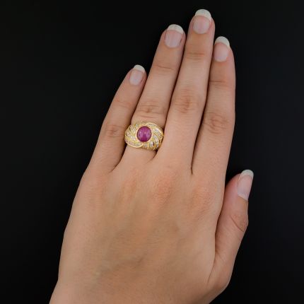 A truly stellar gemstone - a 4.16 carat cabochon ruby imbued with a shimmering 6-ray star, radiates atop swirls of textured 18K yellow gold and sparkling round brilliant-cut diamond stripes in this fabulous finger-hugger. 1.70 carats total diamond weight. Currently ring size 6 1/4.