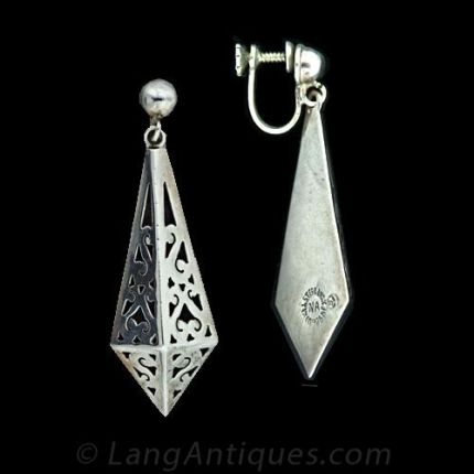 Sterling silver elongated pyramid drop earrings with an openwork scroll motif design. Screw back clips. Stamped Taxco Mexico NA.