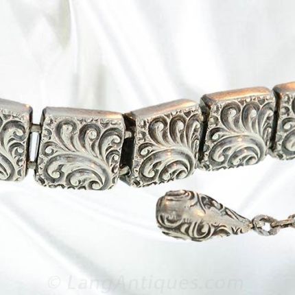 Sterling silver articulated link bracelet featuring a sweet chased scrolling foliate motif with dangling safety chain, circa 1890. This bracelet measures about 1/4 wide.
