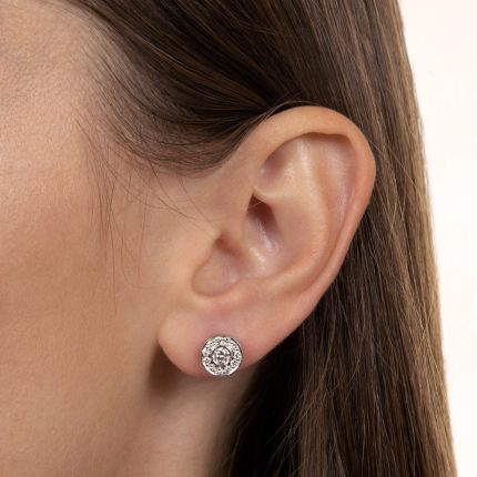 Timeless classics by America's foremost purveyor of pretty precious things in small packages--Tiffany & Company. A sparkling icy-white pair of round brilliant-cut diamonds are encircled by platinum diamond-set halos. Done and Done! .70 carat total diamond weight. Just shy of 3/8 inch diameter.