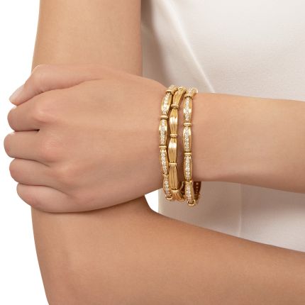 A sumptuous sensation, this Tiffany & Co. bracelet represents the bold and glamorous side of the 1990s in spectacular fashion. Designed with three rows of gently curved, fluted 18K gold links, the bracelet's outer links are set with crisply sparkling round brilliant-cut diamonds, all together creating a luxuriously weighty (67.4 grams) composition that will effortlessly wrap your wrist. Total diamond weight, 6.00 carats. Measures 7 1/8 inches and is accompanied by its original Tiffany & Co. suede box.