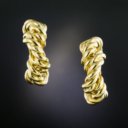 Big, bold, and beautiful braided rope hoops crafted in rich gleaming 18K yellow gold by Tiffany & Co. - America's foremost purveyor of pretty precious things in small packages. However, these aren't so petite at 1 1/4 inch wide!