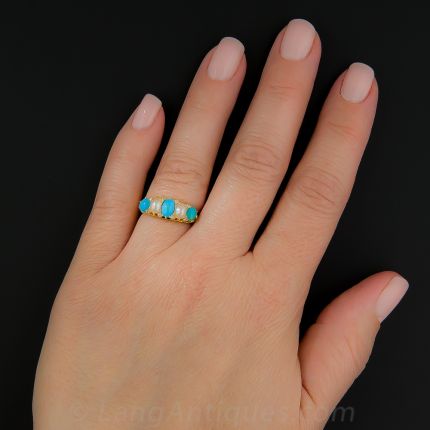 A pristine Victorian band ring with prong-set shimmering natural pearls and turquoise stones set alternating across the top interspersed with tiny twinkling rose cut diamonds in rich 18 karat yellow gold. The ring has English hallmarks stating it was made in Burmingham in 1903. Size 6+.