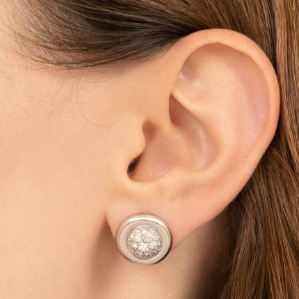 Known for its exceptionally well-crafted and exquisite watches, Vacheron Constantin also produced stunning jewelry such as this pair of diamond stud earrings. Small domes, frosted with pavé-set round brilliant-cut diamonds, are encircled by bold halos of high-polish 18K white gold, making an elegant circular statement at your lobes. Essential wear for a sophisticate such as yourself. Total diamond weight, .90 carat.