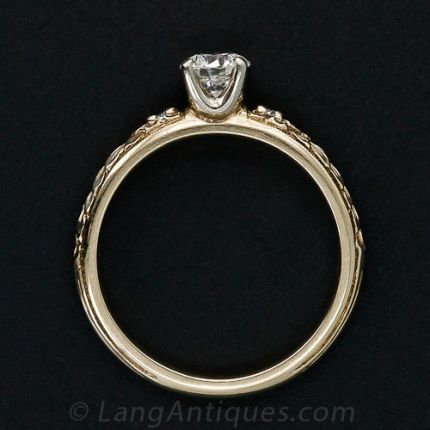 A sparkling round brilliant-cut diamond, weighing just shy of half-a-carat, shines almost solo atop a delightful 18K yellow gold solitaire setting imbued with a charming repousse leaf motif and a tiny pair of diamond twinklers. Die-struck and hand finished in timeless vintage style by the long established jewelry manufacturer - Van Craeynest, formerly of San Francisco.