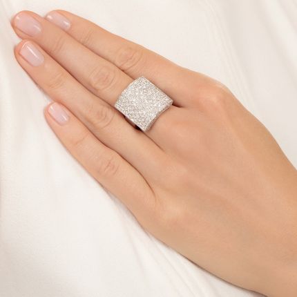 Like a shimmering swathe of lamé fabric, 161 bright-white pavé-set round brilliant-cut diamonds scintillate across the gently curved top and along the sides of this wide and fabulous French jewel, supported by a bold, high-polished band. C'est si bon! Total diamond weight, 2.50 carats. In 18K white gold, it is currently ring size 6 1/4.