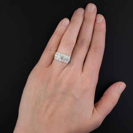 A seamless row of horizontally-set straight baguette diamonds are bordered north and south by rows of bright-white round brilliant-cut diamonds creating a fabulous 3/8 inch wide flash in this marvelous mid-century ultra-sparkler hand fabricated in platinum. 1.65 carats total diamond weight, currently ring size 6.